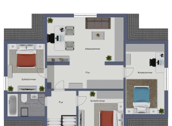 Im OG befinden sich mehrere Schlafräume, die flexibel als Eltern-, Kinder- oder Gästezimmer genutzt werden können. Ein weiteres Arbeitszimmer sowie ein Badezimmer komplettieren die Etage. Die Räume sind großzügig geschnitten und vermitteln durch die zahlreichen Fenster ein helles, freundliches Wohngefühl.