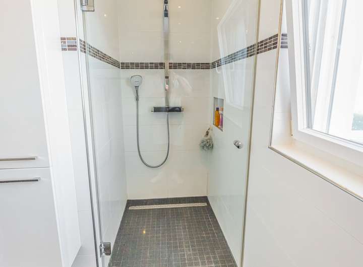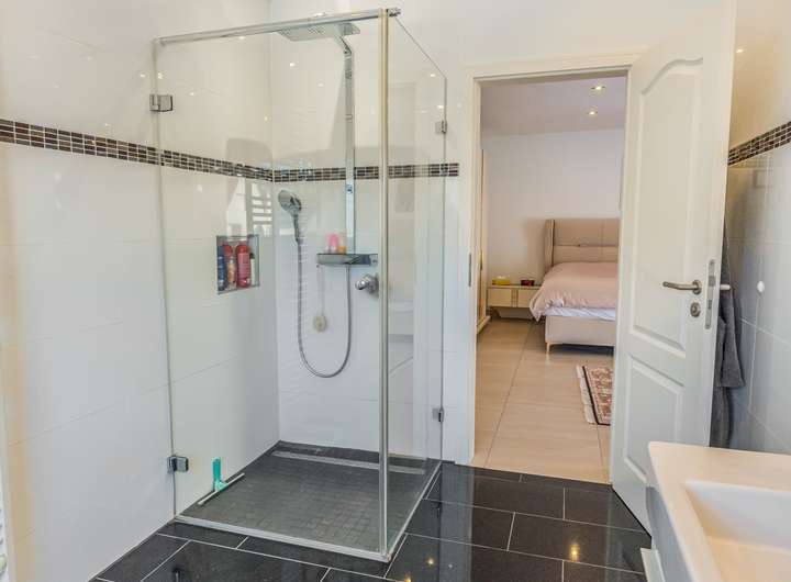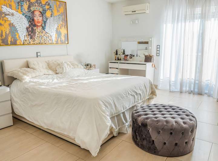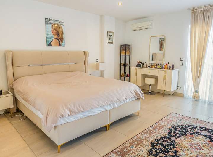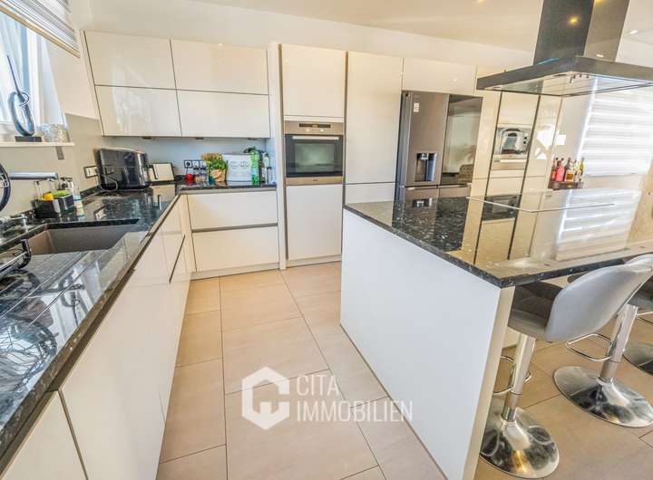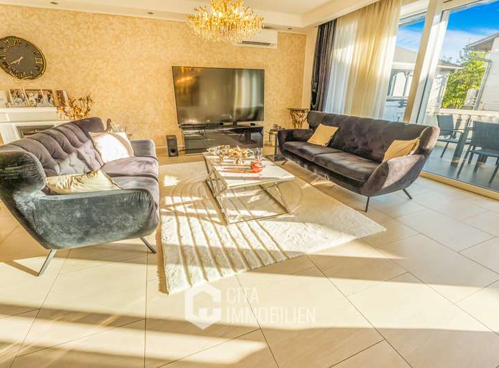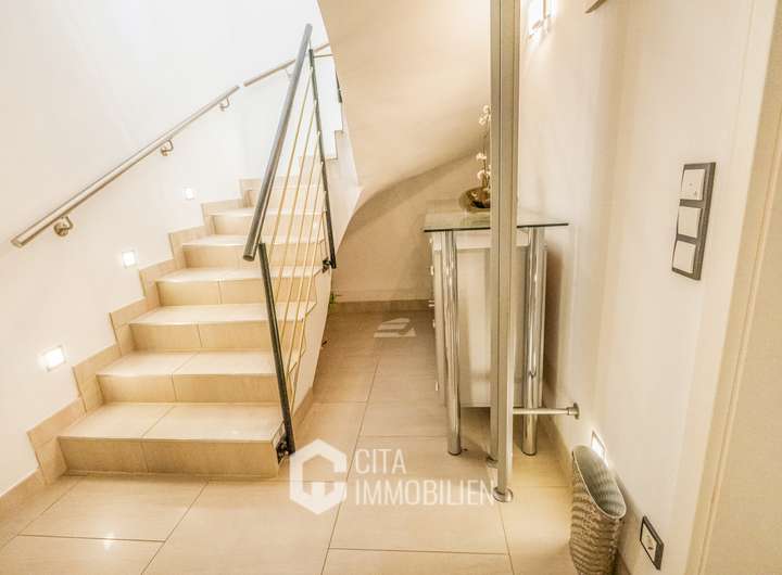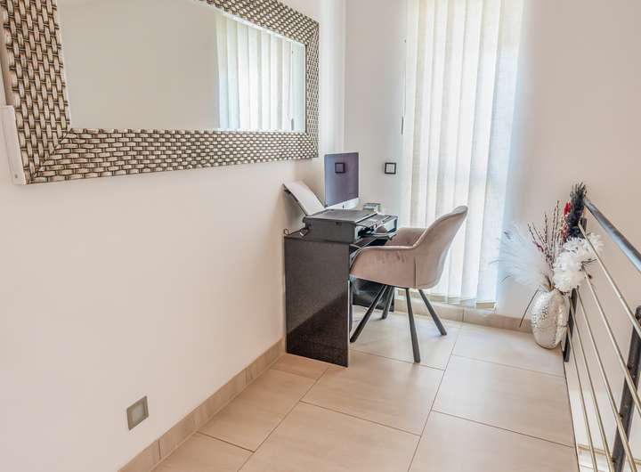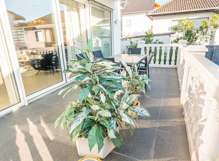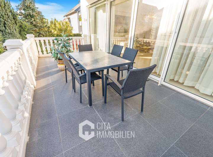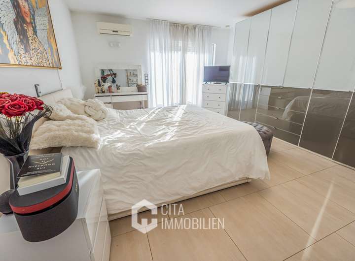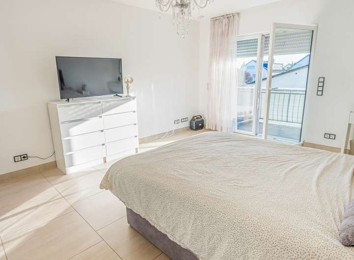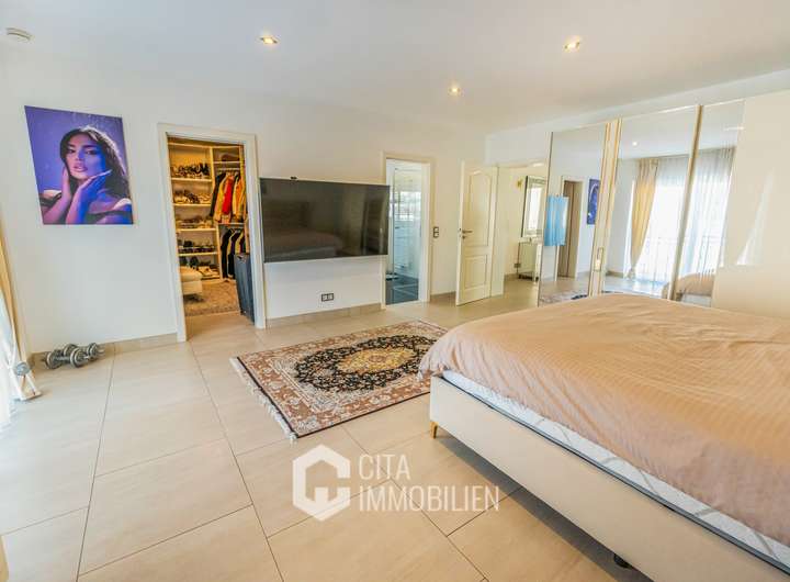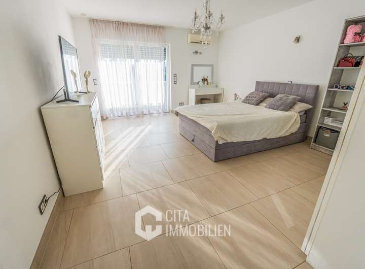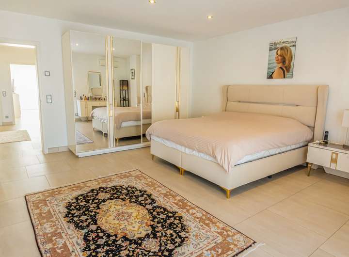 Das Obergeschoss bietet drei Kinderzimmer, ein großes Tageslichtbad, ein Ankleidezimmer, einen praktischen Abstellraum und das Elternschlafzimmer mit Zugang zu zwei Balkonen in Ost- und Westausrichtung. Eine Klimaanlage sorgt in den Sommermonaten für angenehme Raumtemperaturen.
