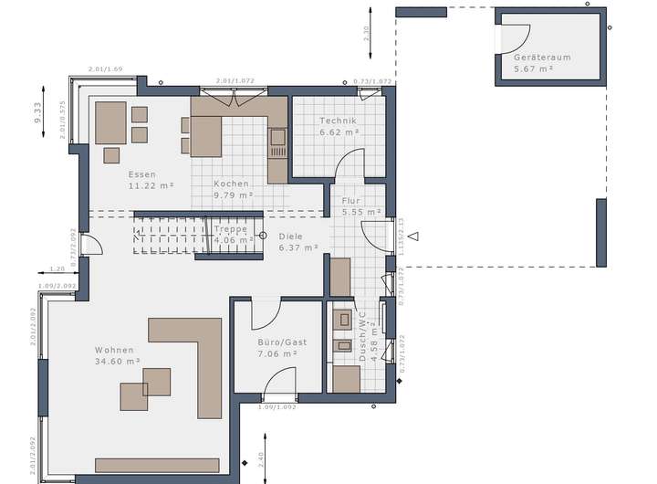 - Bodenplatte inkl. Effizienzhaus 55 Perimeter-Dämmung unterhalb der Bodenplatte sowie stirnseitig