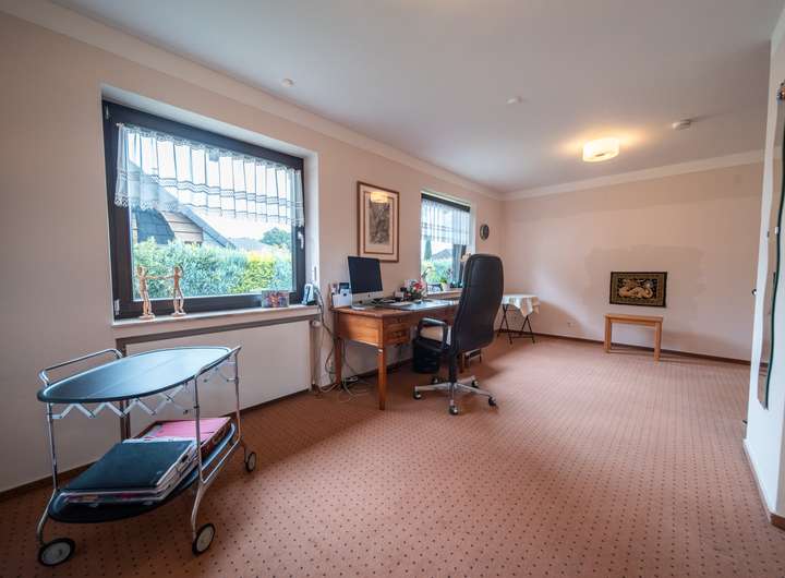 Dieses Einfamilienhaus wurde in massiver Bauweise errichtet und überzeugt durch eine Architektur, die Wohnkomfort und Beständigkeit miteinander verbindet. Der Entwurf ist typisch für die Baukultur der späten 1980er Jahre mit klaren Linien, offenen Raumfolgen und einem durchdachten Lichteinfall, der jedem Bereich eine angenehme Helligkeit verleiht. Großzügige Fensterflächen öffnen den Blick ins Grüne und schaffen eine Verbindung zwischen Innen- und Außenraum, die dem Haus eine ruhige, einladende Atmosphäre gibt.