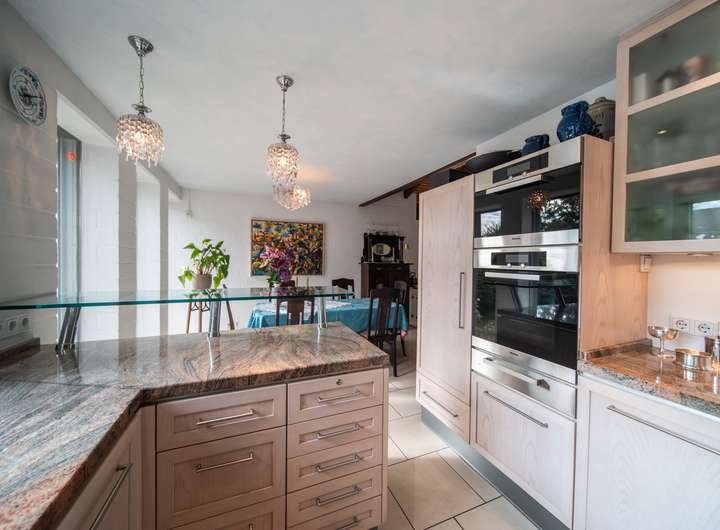 Zeitlose Einbauküche mit guter Arbeitsaufteilung sowie Cerankochfeld, Gaskochfeld, Dunstabzugshaube, Kühlschrank, Geschirrspüler, Dampfgarer, 4 cm Arbeitsplatte aus wunderschönem Juparana Granit