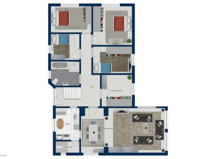 Mit einer Wohnfläche von ca. 142,49 m² verteilen sich insgesamt sechs Zimmer, darunter vier komfortable Schlafzimmer, die ausreichend Platz für die ganze Familie bieten. Ein helles Badezimmer mit Wanne und Dusche rundet das Raumangebot ab.