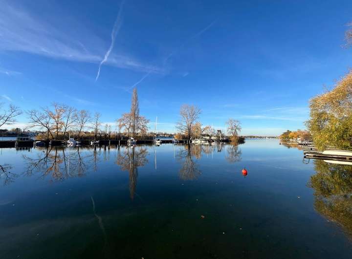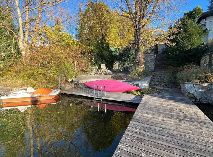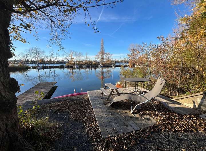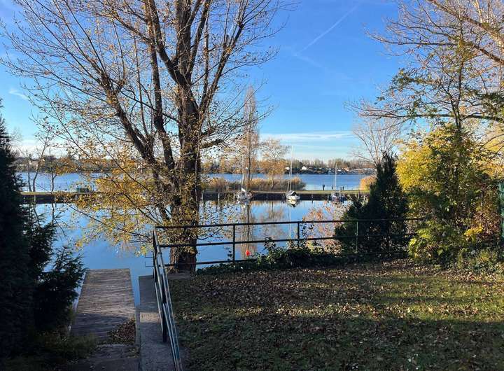 Ein großzügiger Steg erweitert den Uferbereich und bietet direkten Zugang zum See.