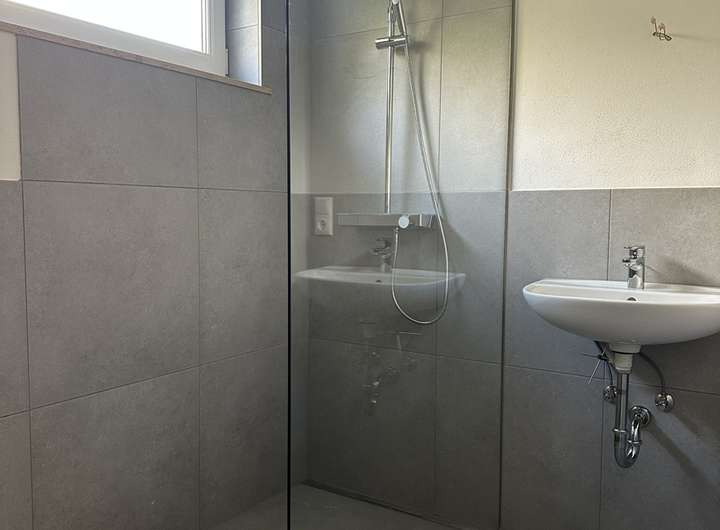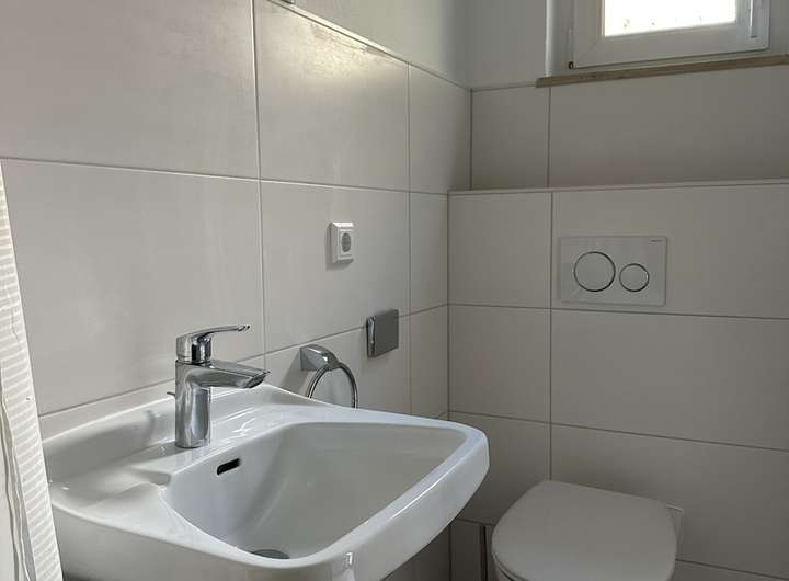 Beim Betreten des Hauses befindet sich auf der rechten Seite ein modernes Tageslichtbad mit Dusche, WC und Waschbecken. Auf der linken Seite liegt die Küche mit großem Fenster, die viel Platz für Ihre individuelle Küchengestaltung bietet.