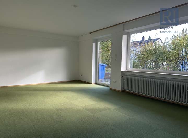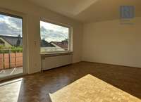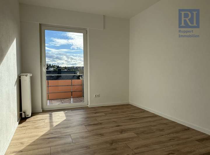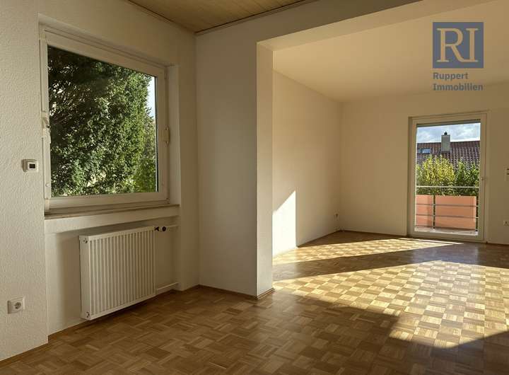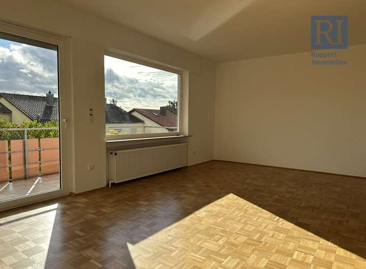 Geradeaus gelangen Sie in den großzügigen Wohn- und Essbereich mit hochwertigem Parkettboden und Zugang zum Balkon, der aufgrund der Hanglage erhöht liegt und einen schönen Ausblick bietet.
