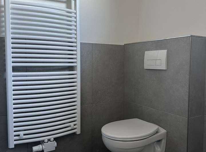 Über die Treppe erreichen Sie das Obergeschoss mit den Schlafräumen. Das Hauptschlafzimmer sowie ein Kinderzimmer verfügen über den Zugang zu einem weiteren Balkon. Ein zusätzliches großes Zimmer kann flexibel als Kinder-, Gäste- oder Arbeitszimmer genutzt werden. Auf dieser Etage befindet sich außerdem ein weiteres Tageslichtbad mit ebenerdiger Dusche, WC und Waschbecken.