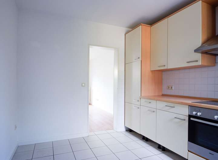 Im Erdgeschoss empfängt ein Flur mit hellen Bodenfliesen den Besucher. Rechts im Flur gelangt man in eine separate Küche mit ebenfalls hellen Bodenfliesen und einem hellgrauen Fliesenspiegel. Die Einbauküche ist vorhanden und besteht aus hellen, freundlichen Fronten sowie Ceranfeld, Backofen, Spüle, Geschirrspüler, Abzugshaube, vielen Schränken und einem Kühlschrank ohne Gefrierfach. Von der Küche sowie vom Flur aus erreicht man das helle Wohnzimmer, das mit einem Vinyl-Designbelag in Eiche-Optik versehen ist und über den Zugang zur Terrasse verfügt. Über den Flur im Erdgeschoss gelangt man außerdem ins Gäste-WC und in den gefliesten Hauswirtschaftsraum, in dem sich auch der Waschmaschinenanschluss befindet.