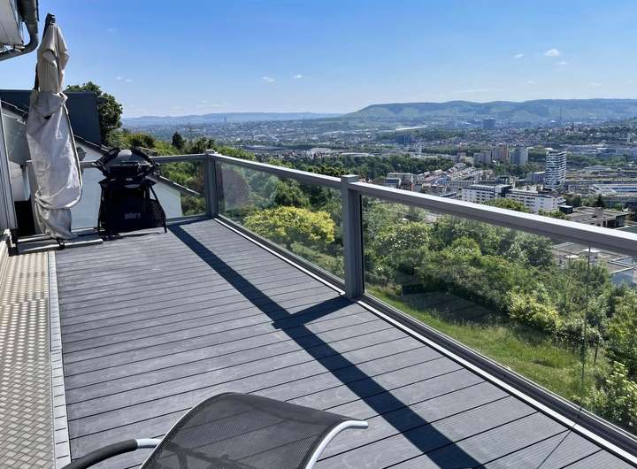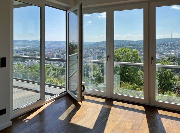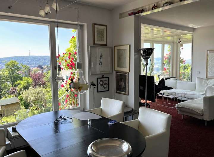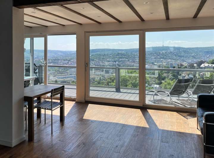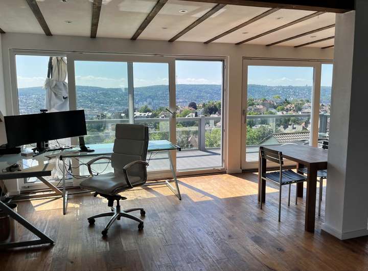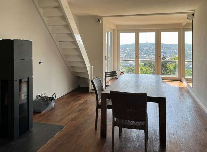 Das ist tatsächlich ein außergewöhnliches Angebot: eine hochwertige Erdgeschosswohnung und eine große, moderne Maisonettewohnung mit zwei riesigen Balkonen im Ober- und Dachgeschoss. Eine Trennung von Ober- und Dachgeschoss ist bereits vorgesehen, sodass das Anwesen auch als klassisches 3-Familienhaus genutzt werden kann. Das Beeindruckendste ist allerdings die phänomenale Aussicht! Die überwiegend bodentiefen Fenster ermöglichen einen herrlichen Blick über den Stuttgarter Talkessel! Diesen unverbaubaren Blick genießen Sie bereits in der Erdgeschosswohnung - im Sitzen!