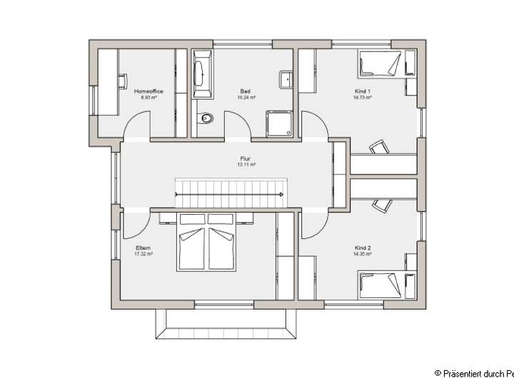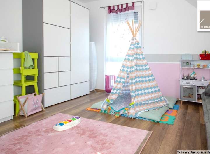 Über eine gerade Treppe gelangen Sie in den großen Flur im Dachgeschoss. Durch die Flachdachgaube ist hier Platz für eine gemütliche Sitzecke vor dem Fenster. Hier befinden sich ebenfalls zwei gleichgroße Kinderzimmer und ein Familienbad. Abgerundet wird diese Etage durch ein Elternschlafzimmer mit Ankleide.