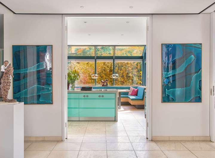 - Schreiner-Einbauküche mit türkisfarbenen, grifflosen Hochglanz-Fronten, ausgestattet mit vier Kochfeldern samt Muldenlüftern, Backofen, Dampfgarer, XXL-Weinkühlschrank (alles Gaggenau), extrabreitem Ofen (Siemens), zwei Wärmeschubladen (imperial), freistehender Kühl-Gefrier-Kombination (Liebherr), Geschirrspüler (Miele), Grohe Blue (Kochendwasser sowie gesprudeltes Wasser)