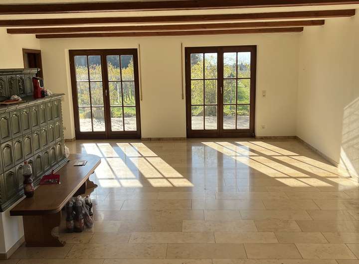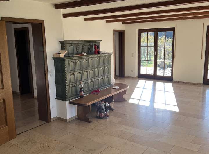 Im Erdgeschoss liegen der Empfangsbereich, die Küche, die Gäste-Toilette, sowie der geräumige Wohn- und Essbereich, welcher, zusätzlich zur Fußbodenheizung, über einen größeren Kachelofen verfügt.