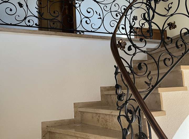 Durch das Marmortreppenhaus gelangen Sie in den ersten Stock, wo Sie die geräumigen Schlafzimmer und das Bad finden, von denen Sie einen großartigen Ausblick genießen.