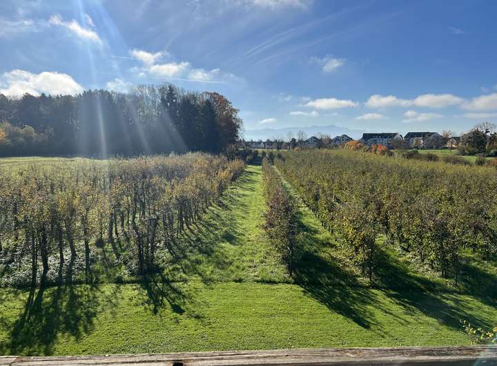Es handelt sich hier um ein Haus in sehr ruhiger und trotzdem stadtnaher Lage, am Rande einer Apfelplantage mit herrlichem Ausblick über einen nahegelegenen, kleinen Wald, sowie die Schweizer Alpen. Trotz der ruhigen Lage, gelangen Sie in wenigen Minuten mit dem Fahrzeug in die Innenstadt von Friedrichshafen. Um das Haus herum befindet sich ein schöner Garten.