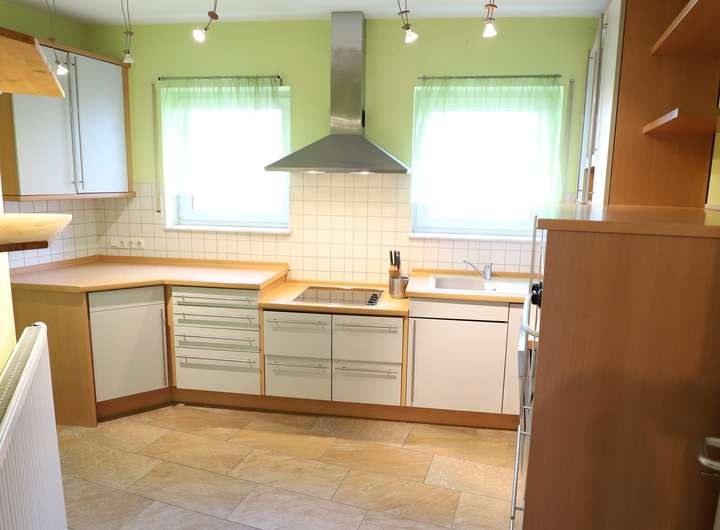 Im Erdgeschoss befindet sich ein großzügiger Wohn-/Essbereich mit direktem Zugang zur Südwest-Terrasse – ideal für entspannte Stunden im Freien. Die angrenzende Einbauküche ist modern ausgestattet. Der Wirtschaftsraum bietet zusätzlichen Stauraum und Platz für Waschmaschine und Trockner.
