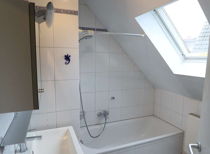 Im Obergeschoss befinden sich zwei Schlafzimmer, von denen eines mit praktischen Einbauschränken ausgestattet ist – perfekt für Ordnung und Stauraum. Das zweite Schlafzimmer kann flexibel als Kinderzimmer, Büro oder Gästezimmer genutzt werden. Ein modernes Tageslichtbad mit Badewanne rundet das Raumangebot ab.