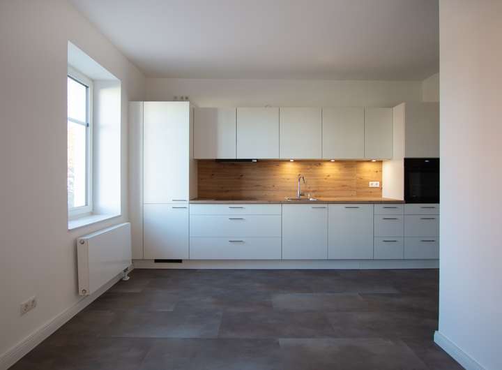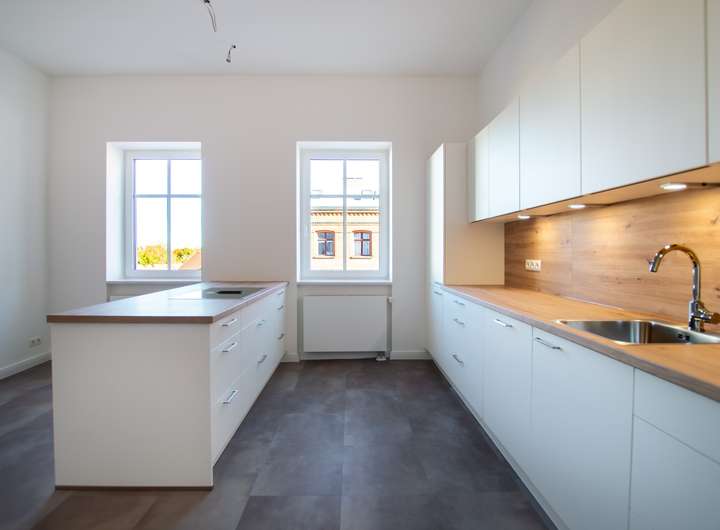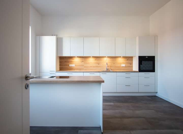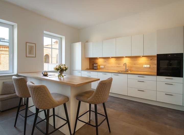 + zwei großzügige, neue Küchen mit AEG-Geräten, Küche im OG verfügt über eine Kochinsel, Vinyl Böden in Steinoptik