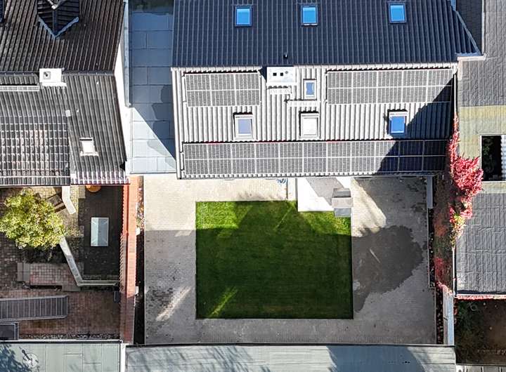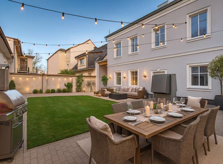 + Hof mit Grünfläche und großer, gepflasterter Terrasse