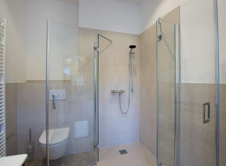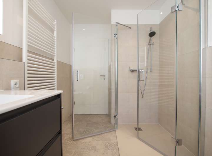 mit flexibler Duschabtrennung, 1 Bad mit begehbarer Dusche mit Sitz