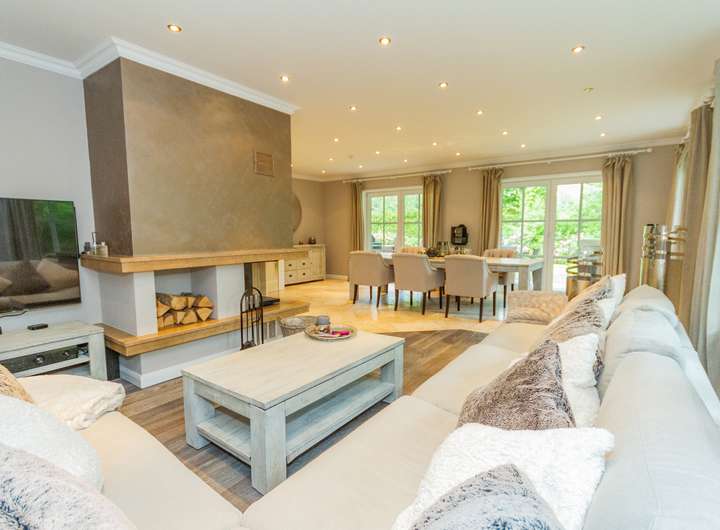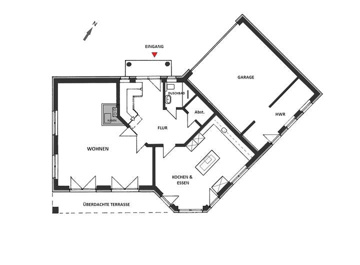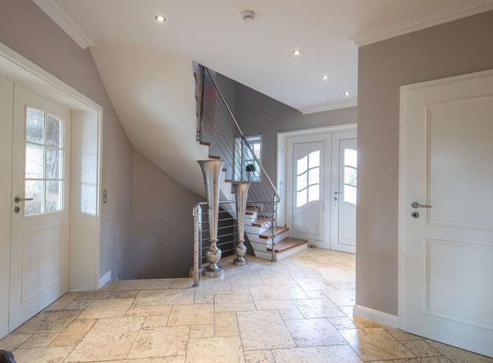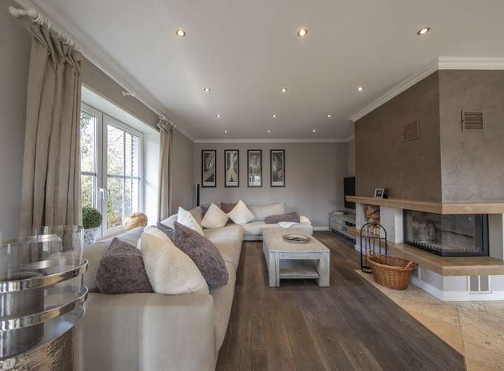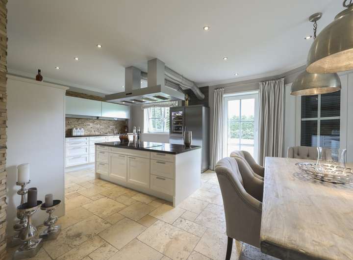 die geräumige Küche mit separatem Essplatz, ein Duschbad sowie ein Abstellraum angeordnet. Ein Teilbereich ist der Garage vorbehalten. Die Böden sind hier durchgängig mit einem Naturstein-Belag aus Travertin ausgestattet, im Wohnzimmer wurde ein Teilbereich als Holzboden mit gekälkter Mooreiche ausgeführt. Der Kamin sorgt bei norddeutschem Schmuddelwetter für angenehme Behaglichkeit.