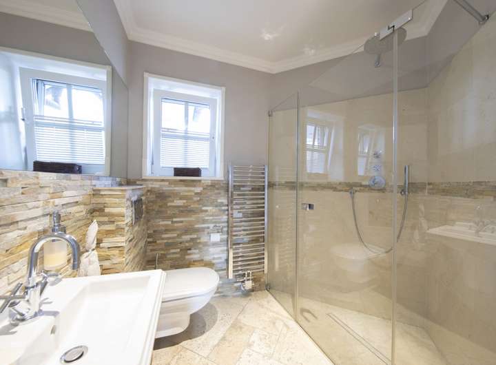 Im EG finden Sie ein mit hochwertigen Markenfabrikaten und Materialien ausgestattet Duschbad. Die Wandverkleidung hier wurde aufwendig mit Limestone-Bricks gestaltet.