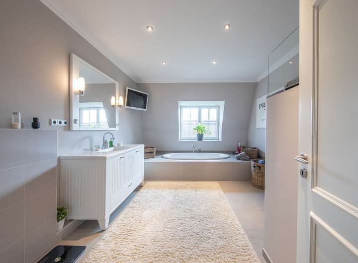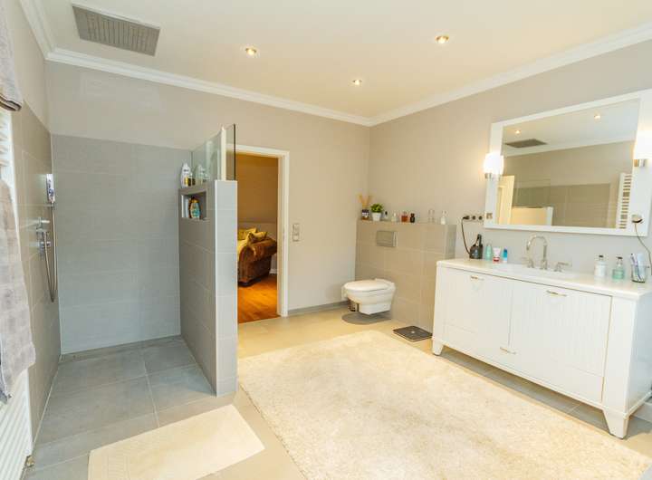und Warmwasserbereitung erfolgt über eine BUDERUS Gaszentralheizung. Eine Trinkwasserenthärtungsanlage ist installiert. Die Wohnbereiche werden mit elektronisch dimmbaren Downlights