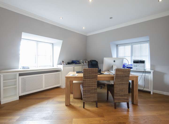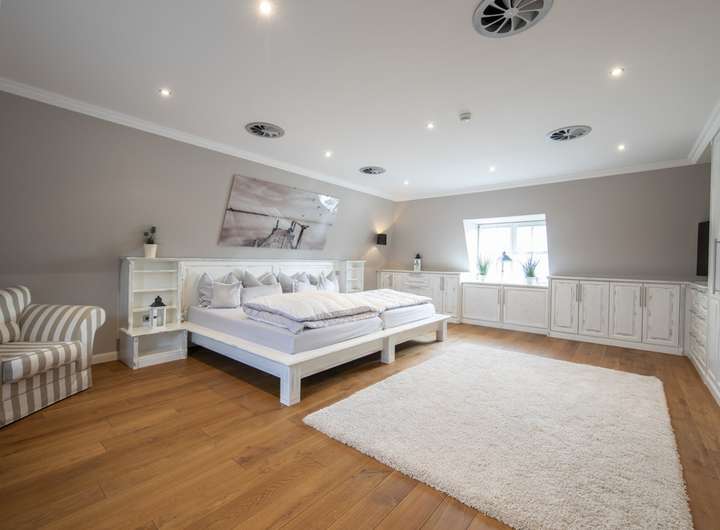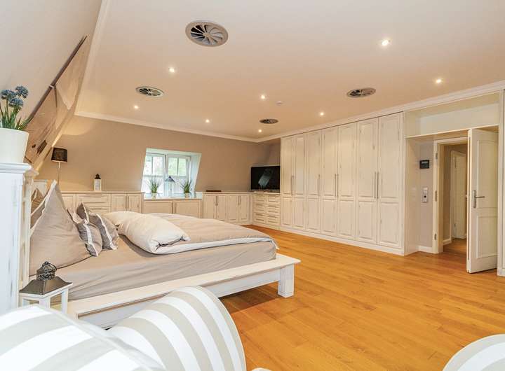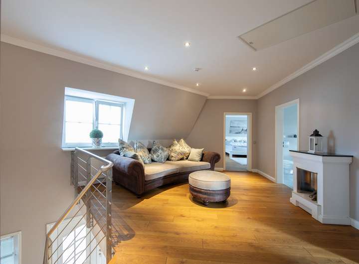 Im Mansardgeschoss gelangen Sie über die großzügige Galerie zum Studio, den 3 weiteren Schlafzimmern sowie zum Masterbad. Dielenböden aus geölter Eiche, Stuckleisten und Downlights sowie hochwertige Tischler-Maßeinbauten prägen hier die hochwertige Ausstattung. Das als Schlafzimmer genutzte Studio verfügt über eine elektronisch regelbare Lüftungsanlage.
