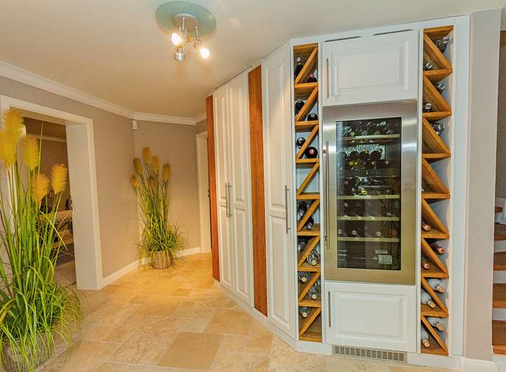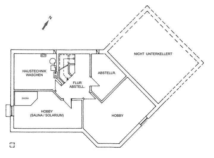 Im Kellergeschoss sind zwei Zimmer, ein Abstellraum sowie ein Technik-/ Waschraum angeordnet. Hier befindet der Wellnessbereich mit Sauna und Solarium. Im Flurbereich wurden vom Tischler Weinschränke und -regale einschließlich integrierten Kühler maßgefertigt. Der separate Ab-stellraum verfügt ebenfalls über Einbauschränke und Regale.