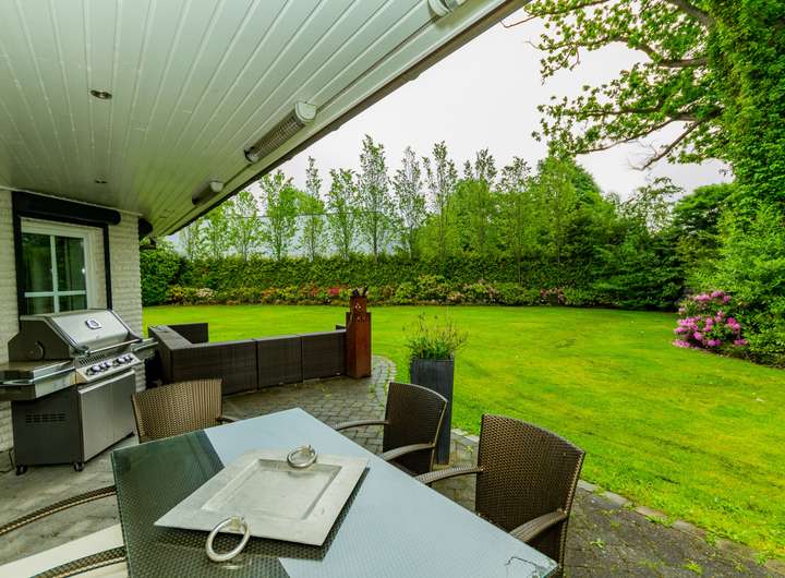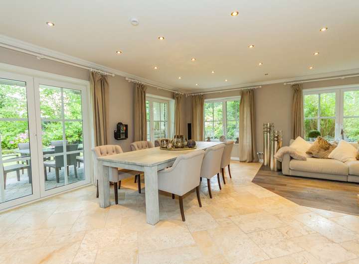 Bodentiefe Fenstertüren richten den Blick vom Wohnzimmer und von der Küche in den nicht einsehbaren Garten und bieten Zugang zur teilweise überdachten und beheizten Gartenterrasse.