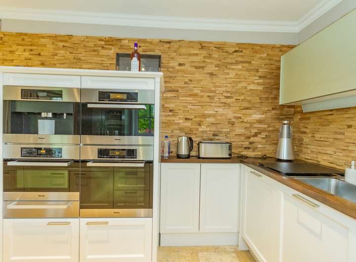 In der ca. 30 qm großen Küche erwartet nicht nur den ambitionierten Hobbykoch Equipment vom Feinsten. Die POGGENPOHL Einbauküche wurde 2016 installiert und verbindet modernes Design mit dem Luxus edler Materialien. Exklusive Küchentechnik von MIELE mit ergonomisch angeordneten Backofen, Dampfgarer, Espressomaschine, Mikrowelle und Wärmefach gehören ebenso zur Ausstattung wie ein großer Side-by-Side Kühlschrank mit Weinkühler.
