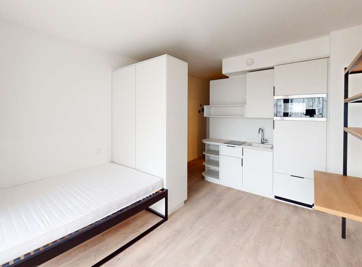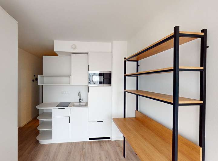 Ein kompakt geschnittenes, wohnlich möbliertes und effizient nutzbares Zuhause, in dem man weder auf Komfort noch auf Design verzichten muss. Vom Eingangsbereich gelangt man in Bad und Wohnbereich, welcher mit einer Einbauküche ausgestattet ist. Der Balkon ist vom Wohnzimmer aus begehbar. Ausgestattet mit hochwertigen Küchenmöbeln, Schränken, Bett, Sofa, Esstisch und Arbeitsbereich ist das 1-Zimmer-Apartment die perfekte Kombination für Singles, Studenten, Pendler und Professionals, die mehr wollen als nur einen Platz zum Schlafen.