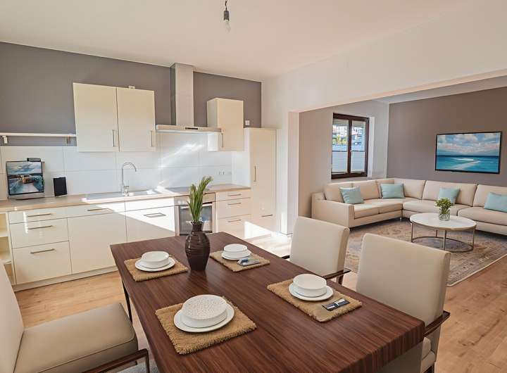 * Großer, offen gestalteter Wohn-, Ess- und Kochbereich