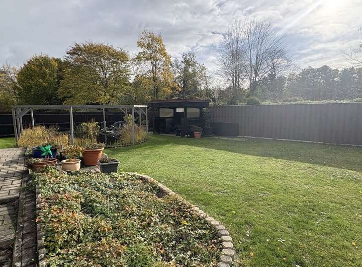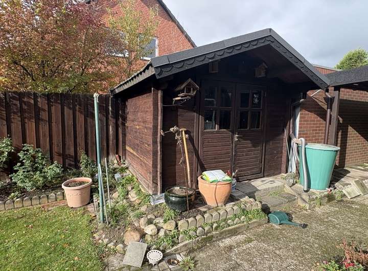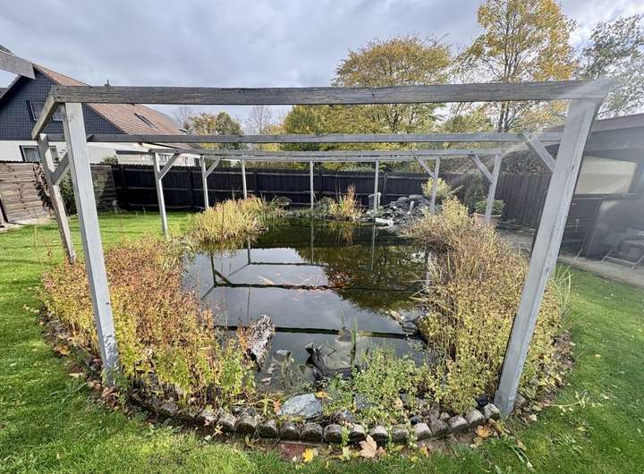Das etwa 656 m² große Grundstück bietet vielfältige Möglichkeiten zur Entfaltung im Freien. Der liebevoll und pflegeleicht angelegte Garten lädt zu entspannten Stunden und geselligen Momenten ein. Ein besonderes Highlight ist der große Gartenteich mit einer kleinen Koi-Familie, der für eine idyllische Atmosphäre sorgt.