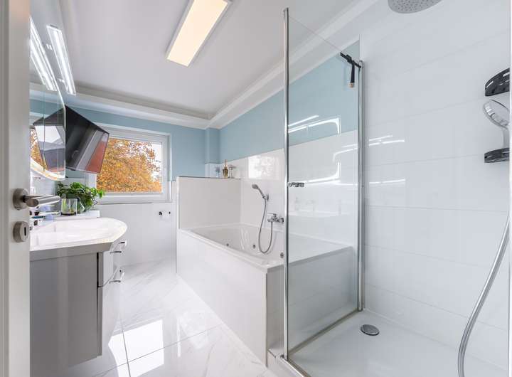 - Großes Badezimmer mit Whirlpool-Badewanne, bodengleicher Dusche, WC und Doppelwaschbecken