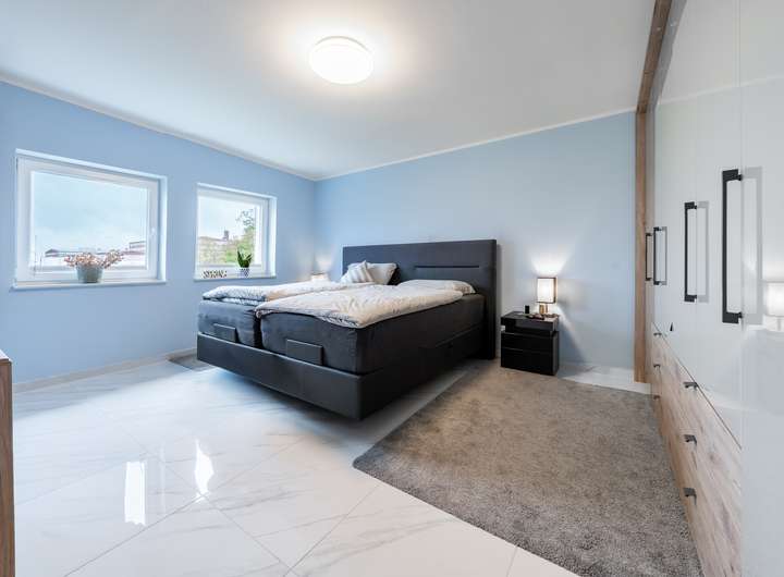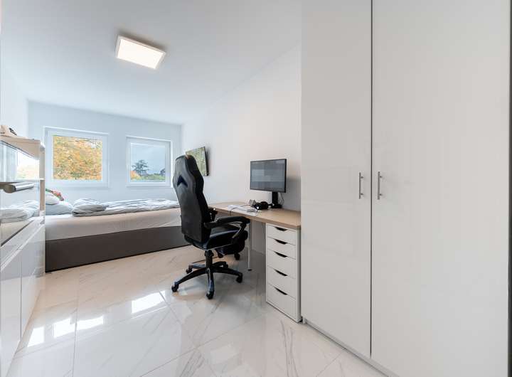 Das Penthouse verfügt über insgesamt 3 Zimmer, darunter zwei geräumige Schlafzimmer, die vielfältige Nutzungsmöglichkeiten bieten – ob als Elternschlafzimmer, Gästezimmer oder als hochwertiges Homeoffice. Bodentiefe Fenster sorgen für ein helles, einladendes Raumgefühl und schaffen eine freundliche Atmosphäre, die zum Entspannen einlädt. Das großzügige, modern gestaltete Badezimmer überzeugt mit hochwertigen Armaturen, großformatigen Fliesen und einer durchdachten Ausstattung, die höchsten Komfort garantiert. Ein besonderes Highlight ist die elegante Einbauküche: sie fügt sich harmonisch in das offene Wohn- und Esskonzept ein und bietet ideale Voraussetzungen für kulinarische Genüsse, gesellige Abende oder den gemütlichen Morgenkaffee.
