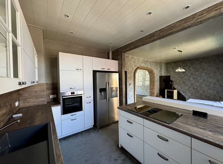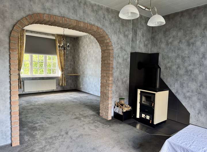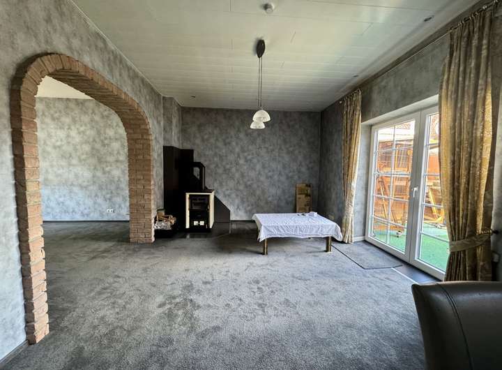 Das lichtdurchflutete Wohnzimmer empfängt Sie mit großen Fenstern, die den Raum in natürliches Tageslicht tauchen und eine offene, freundliche Stimmung schaffen. Ob beim gemütlichen Abend am Kaminofen oder beim fröhlichen Beisammensein mit Familie und Freunden – dieser Ort lädt zum Verweilen ein. Der großzügige Grundriss bietet dabei vielfältige Möglichkeiten, den Wohnraum ganz nach den eigenen Vorstellungen zu gestalten und daraus ein gemütliches Zuhause zu erschaffen.