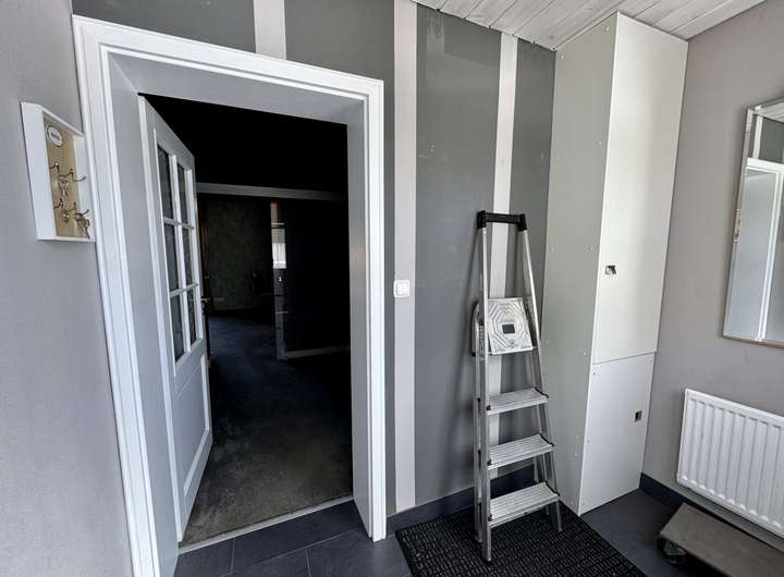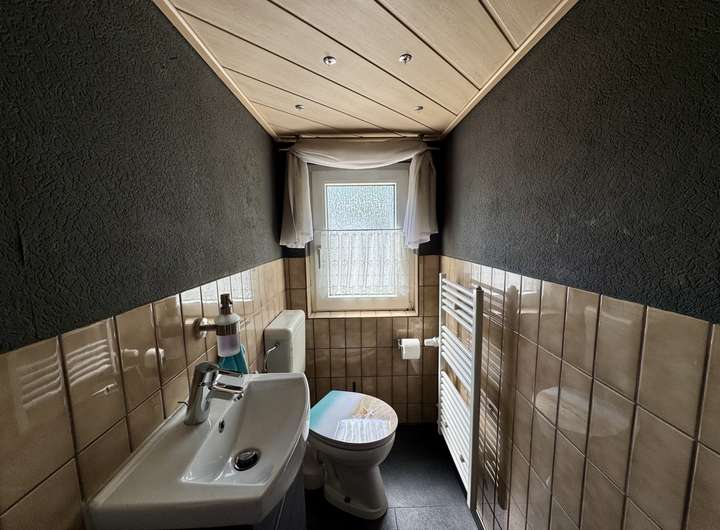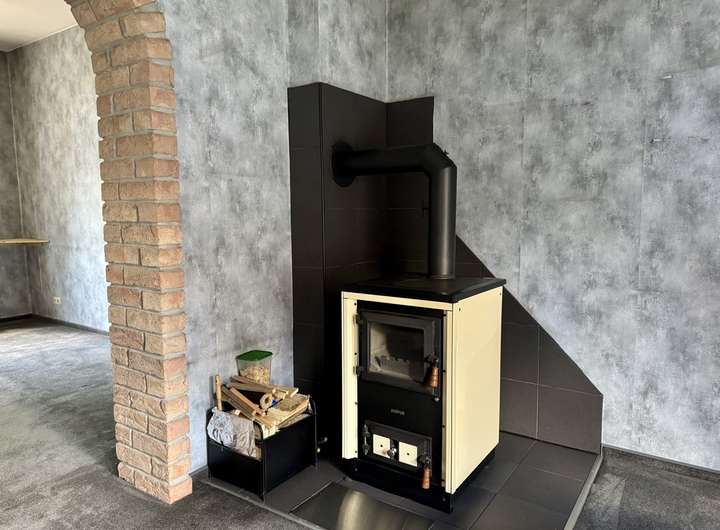 Im Herzen des Hauses befindet sich der Kaminofen, über den das gesamte Gebäude beheizt wird – ein nachhaltiges und zugleich behagliches Heizsystem. Die Warmwasserversorgung erfolgt effizient über einen Durchlauferhitzer.