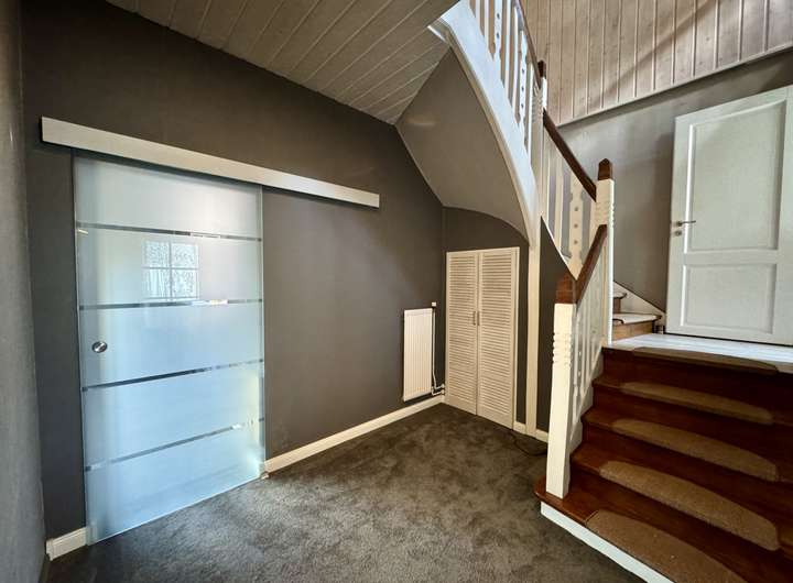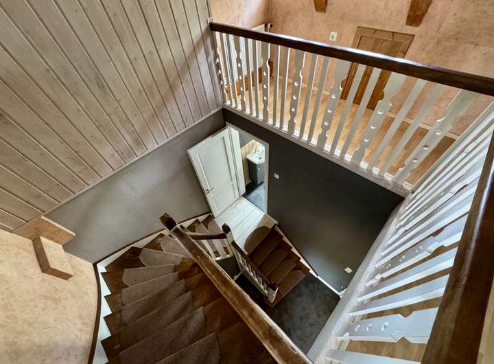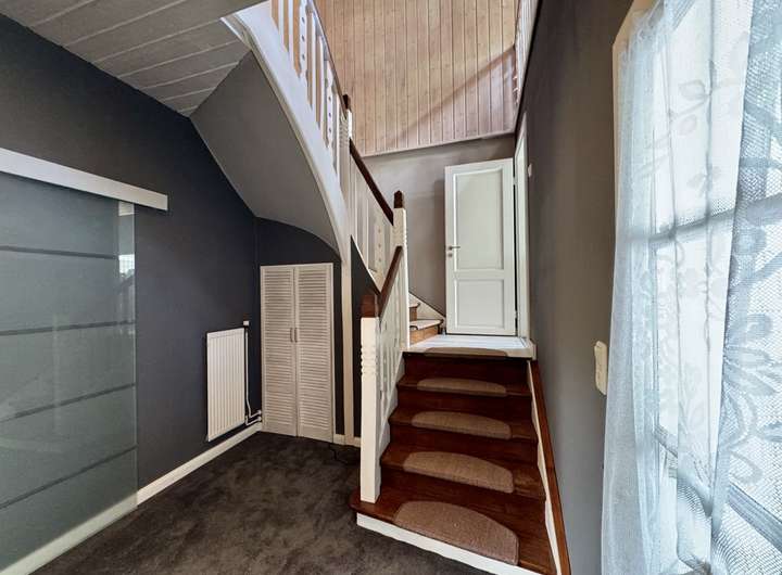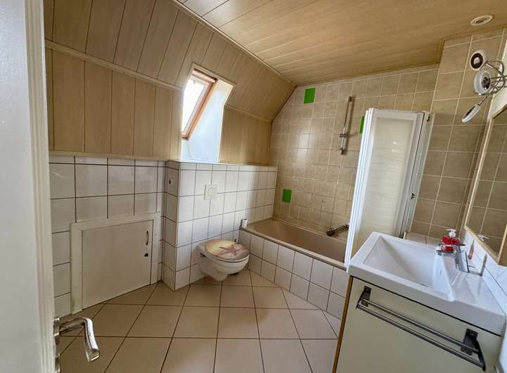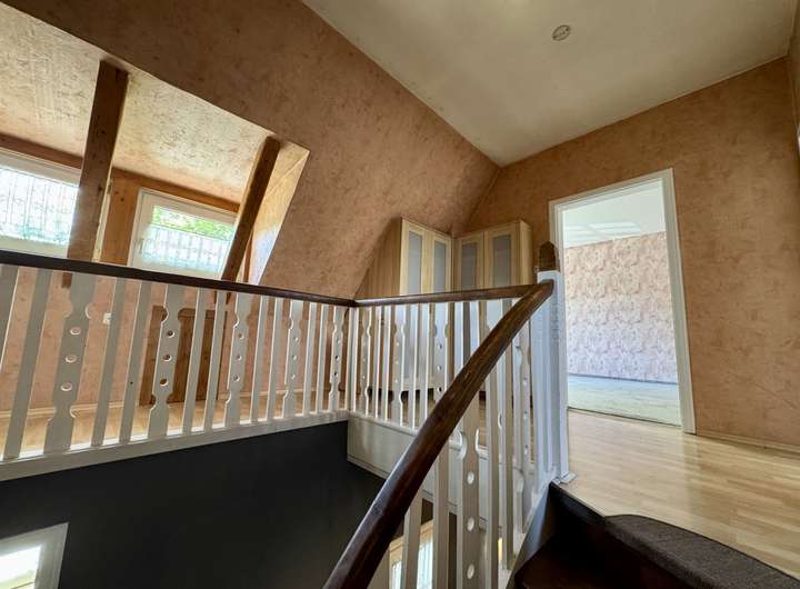 Über eine elegant geschwungene Treppe gelangen Sie ins Dachgeschoss, wo ein großzügiger, offener Flur zu zwei charmanten Zimmern führt. Eines davon wird derzeit als Ankleidezimmer genutzt, lässt sich aber ebenso gut als Büro oder Gästezimmer gestalten. Ein stilvolles Wannenbad sowie ein kleines Gäste-WC auf halber Höhe ergänzen den Wohnkomfort.