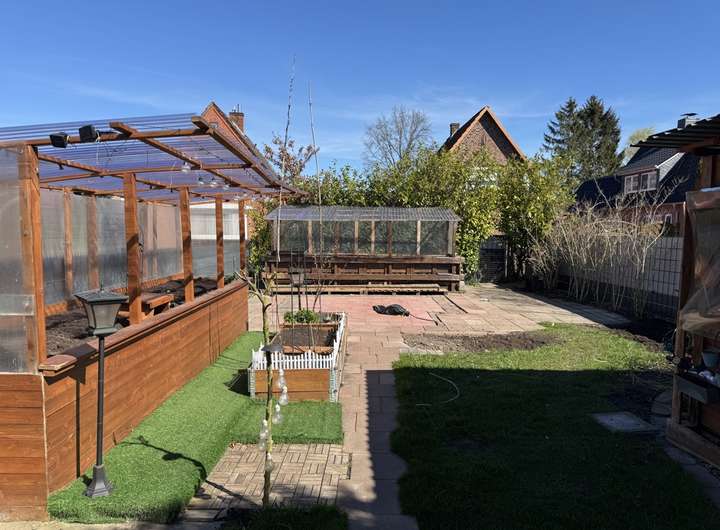 Der Garten ist ein wahres Refugium für Naturfreunde: Mit einem gemütlichen Wintergarten, einer sonnigen Terrasse, Hochbeeten und Obstbäumen bietet er Raum für Entspannung und kleine Auszeiten im Grünen. Spielen Sie mit Ihrem grünen Daumen und gestalten sich Ihr kleines Paradies. Das eingezäunte Grundstück schenkt Sicherheit für Kinder und Haustiere.