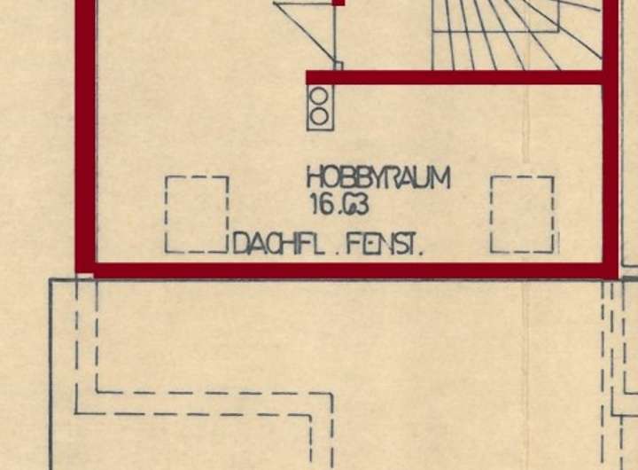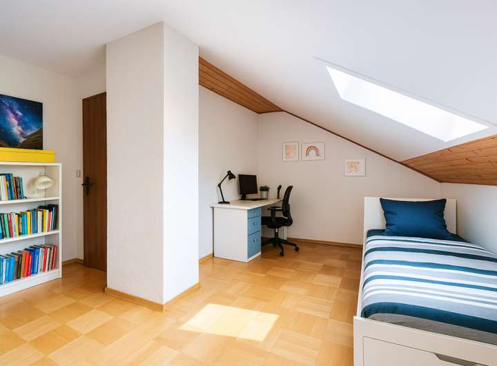 Ein mit Dachflächenfenstern belichtetes, geräumiges Studiozimmer wurde im Dachgeschoss untergebracht. Hier besteht noch die Möglichkeit ein eigenes Duschbad zu installieren.