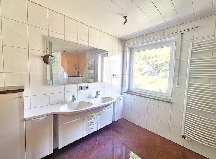 Ein großes Badezimmer mit einem Doppelwaschtisch, einer begehbaren Dusche und einem WC rundet den Komfort auf dieser Etage ab.