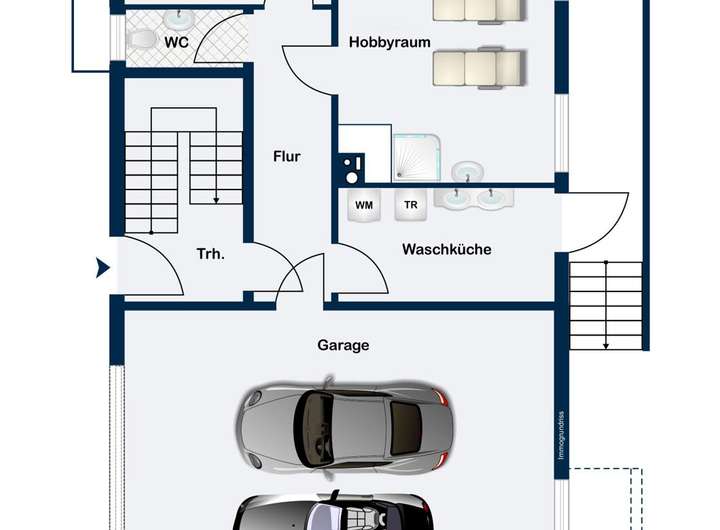 Das Erdgeschoss beinhaltet den Gästebereich mit Gastzimmer und eigenem WC. Angrenzend findet sich ein großer Hobbyraum, der sich sehr gut auch als Wellnessbereich mit Saunamöglichkeit nutzen lässt. Die Waschküche verfügt über einen direkten Zugang zum Garten. Vom Flurbereich kann man die Doppelgarage betreten.