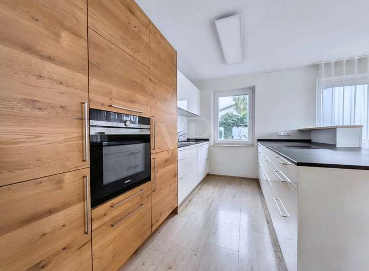 Zur Hauptwohnung gelangt man über eine Treppe ins Obergeschoss. Hier befinden sich ein Bad und separates WC mit den beiden Schlafzimmern. Highlight ist der offene Wohn-Essbereich mit der modernen Einbauküche und dem umlaufenden Balkon. Durch das hanglagige Grundstück ergibt sich ein direkter Zugang über die beiden Schlafzimmer in den Garten. Teils bodentiefe Fensterfronten lassen viel Licht in die Räumlichkeiten.