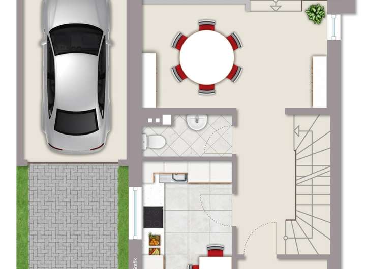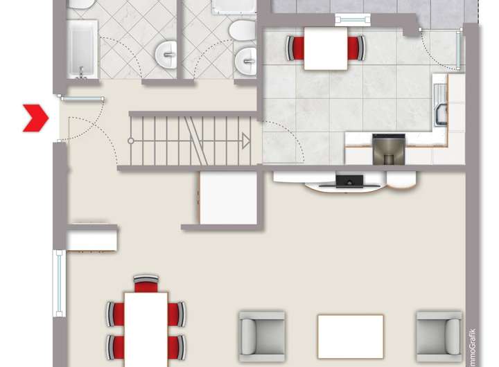 Hier finden Sie im Erdgeschoss einen großräumigen Wohn-Essbereich sowie die Küche und ein Gäste-WC vor.