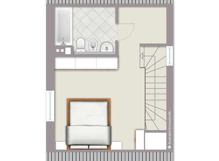 Hinauf in das Obergeschoss, dort erwartet Sie ein schöner Schlafraum nebst Bad mit Wanne.