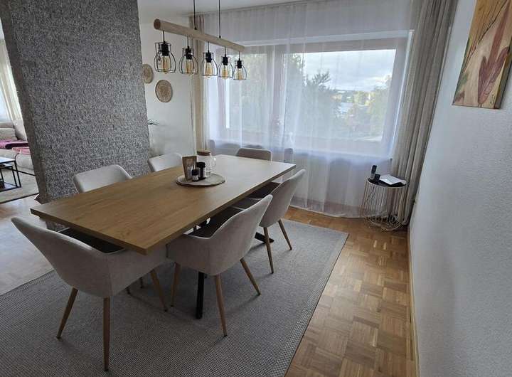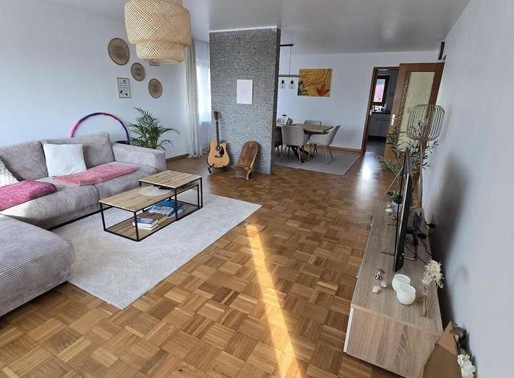 Highlight ist das Wohn-/Esszimmer mit attraktivem Raumteiler und angrenzendem Balkon. Nebenan ist die möblierte Küche, welche nach Rücksprache mit den jetzigen Mietern gerne übernommen werden kann. Und zuletzt ein kleiner Hauswirtschaftsraum, wo Sie Platz haben für Staubsauger, Putzmittel oder Lebensmittel etc.