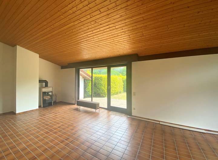 Das großzügig gestaltete Erdgeschoss beeindruckt mit hohen Decken, weitläufigen Räumen und großen Fensterflächen, die für viel Tageslicht und ein offenes Wohngefühl sorgen. Der Wohnbereich ist zur Terrasse und zum Garten hin verglast und bietet einen herrlichen Blick ins Grüne.