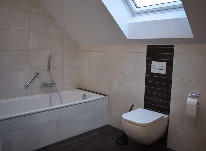Im Dachgeschoss befinden sich zwei Schlafzimmer und ein weiteres Bad mit ebenerdiger Dusche.