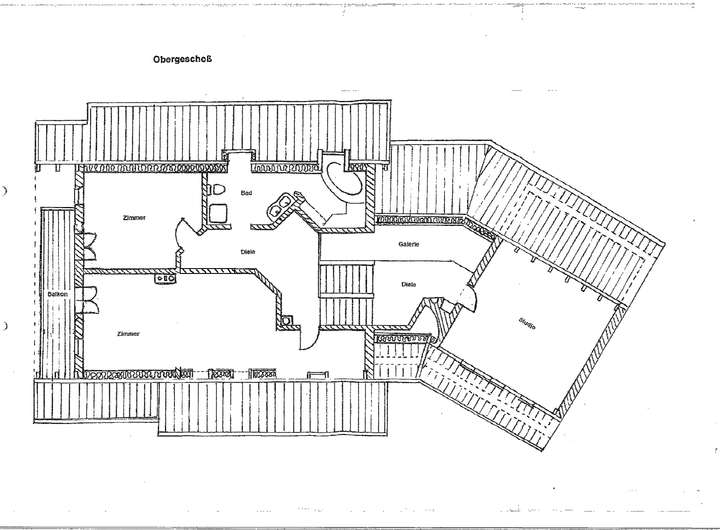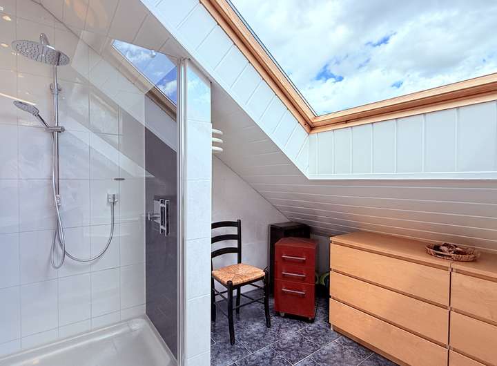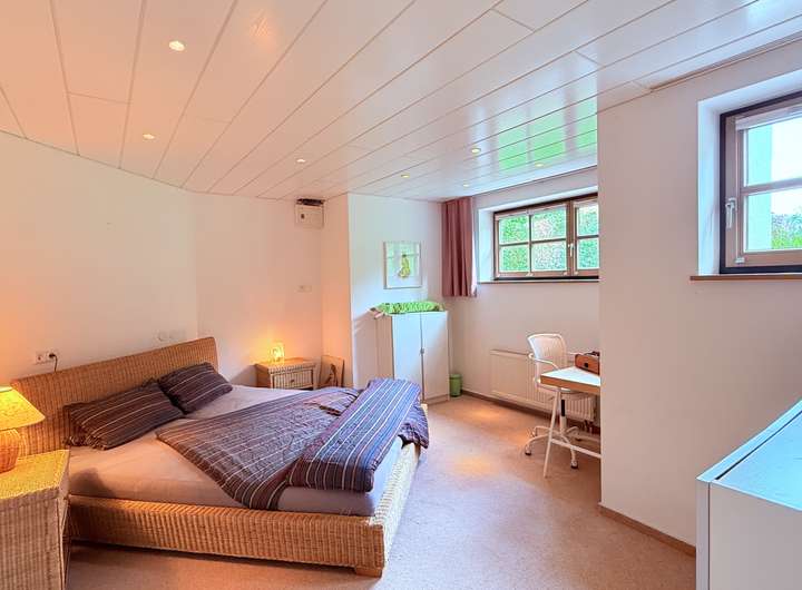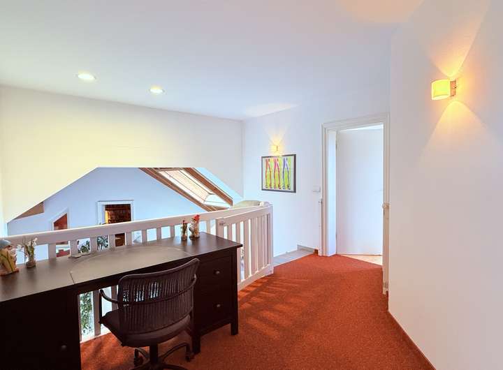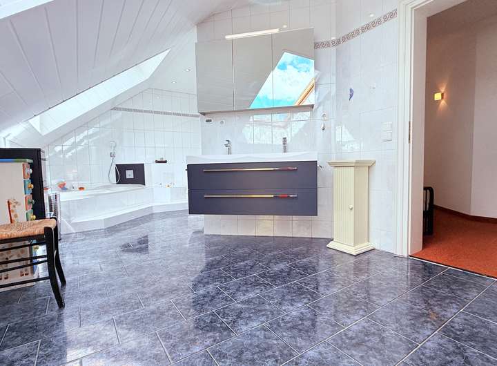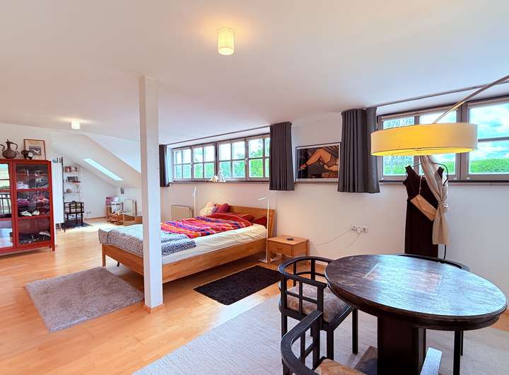 Im Obergeschoss befindet sich ein großflächiges Schlafzimmer mit charakteristischen Gauben, das bei Bedarf in zwei separate Räume unterteilt werden kann. Ein helles Badezimmer mit Fenster, Badewanne und Dusche bietet ausreichend Platz und Tageslicht. Über der Doppelgarage, die vollständig unterkellert ist, wurde ein geräumiges Studio realisiert, das derzeit als Heimkino genutzt wird, aber vielseitige Nutzungsmöglichkeiten bietet.