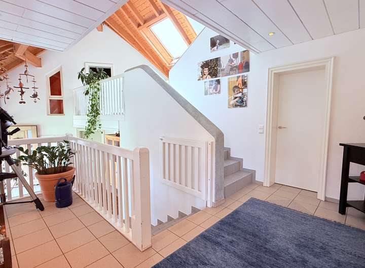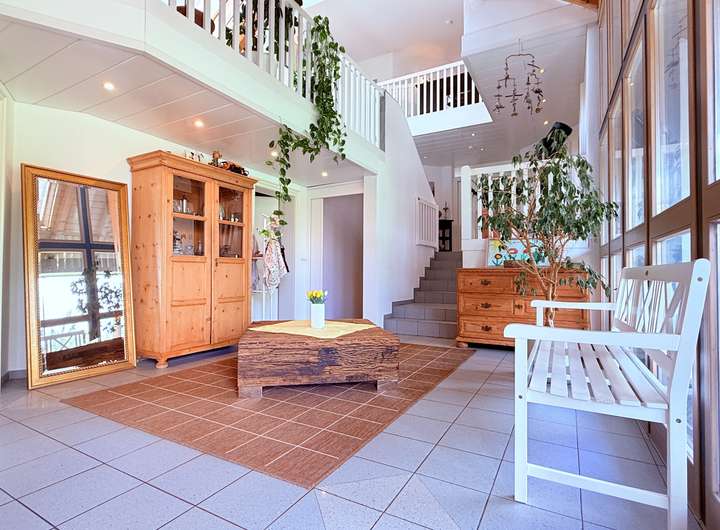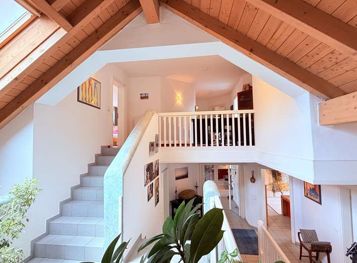 Dieses großzügige Anwesen vereint repräsentative Architektur mit durchdachter Funktionalität und liegt in bevorzugter Lage mit unverbaubarem Weitblick. Bereits der helle, herrschaftlich gestaltete Eingangsbereich mit offener Galerie vermittelt beim Betreten ein eindrucksvolles Raumgefühl. Im Erdgeschoss sorgt das Splitlevel für eine interessante Raumaufteilung und unterstreicht die architektonische Besonderheit des Hauses.