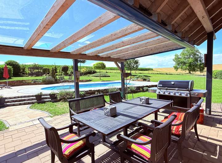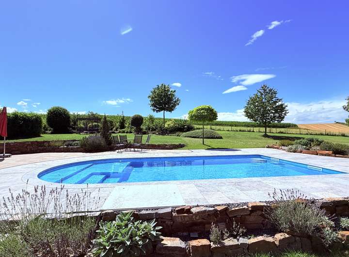 Die große, teils überdachte Terrasse eröffnet einen beeindruckenden Panoramablick in die Umgebung und führt direkt zum gepflegten Salzwasserpool, der in den Außenbereich harmonisch eingebettet ist. Eine zusätzliche Toilette mit direktem Zugang vom Poolbereich erhöht den Komfort im Sommerbetrieb.